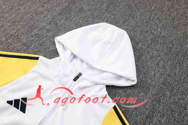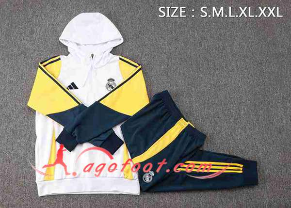 Ensemble Survetement Veste A Capuche Coupe-Vent Real Madrid Blanc/Jaune/Bleu 2024/2025